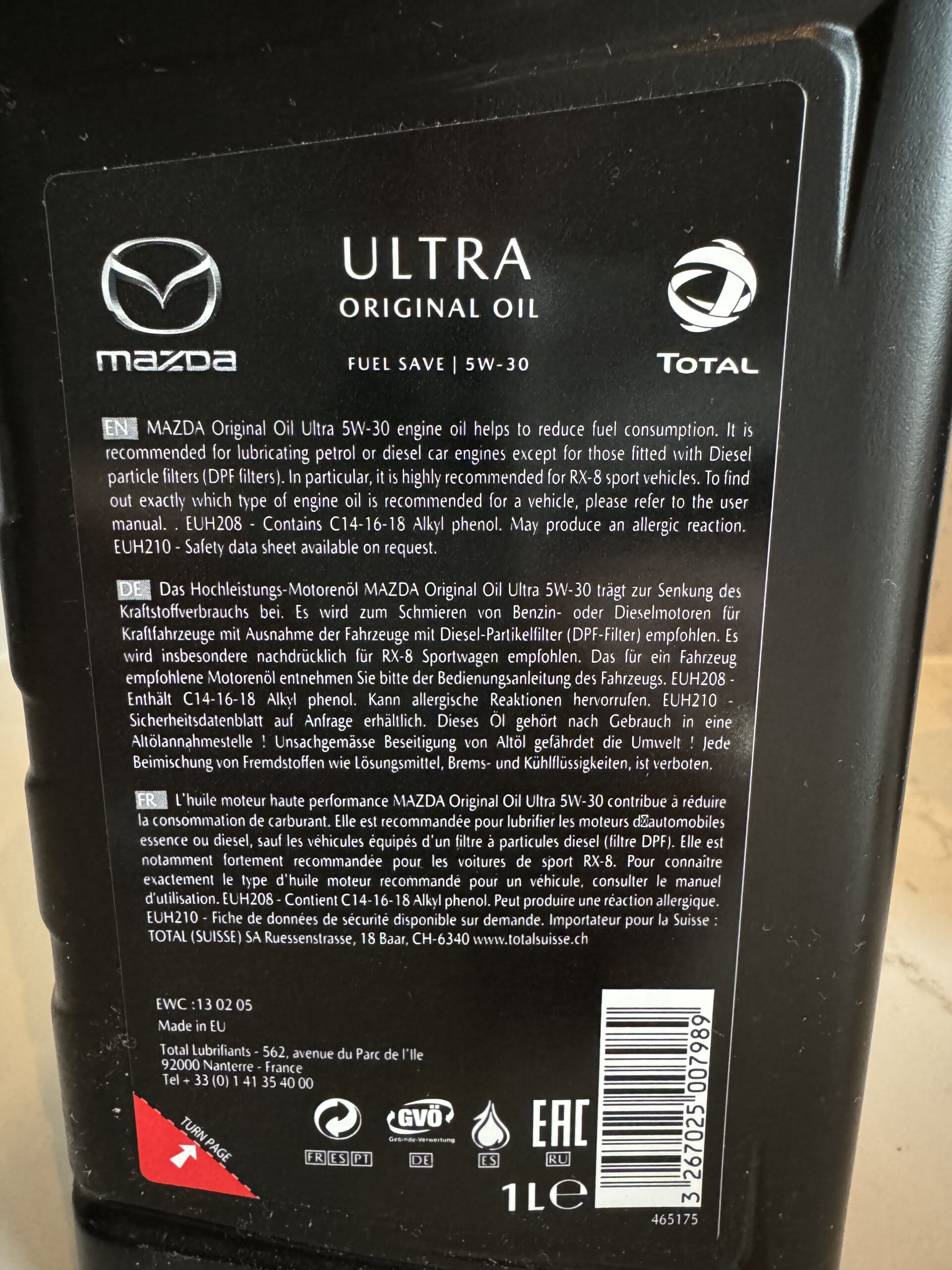 Hoogwaardige motorolie, speciaal voor Mazda geproduceerd door Total. De A5/B5 specificatie garandeert een lager brandstofverbruik.
