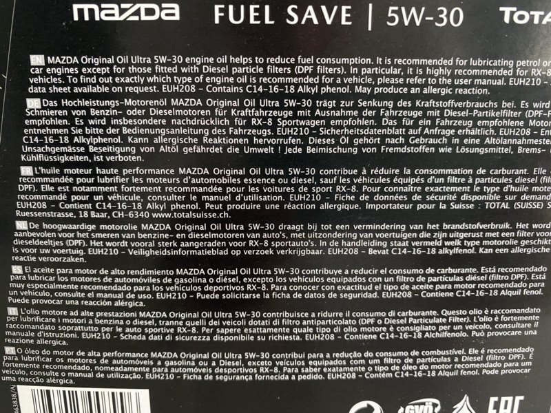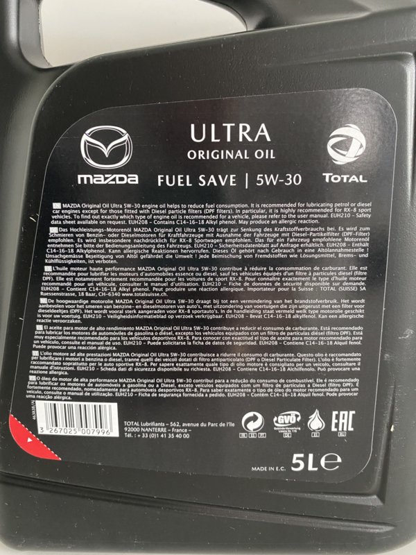 Hoogwaardige motorolie, speciaal voor Mazda geproduceerd door Total. De A5/B5 specificatie garandeert een lager brandstofverbruik.